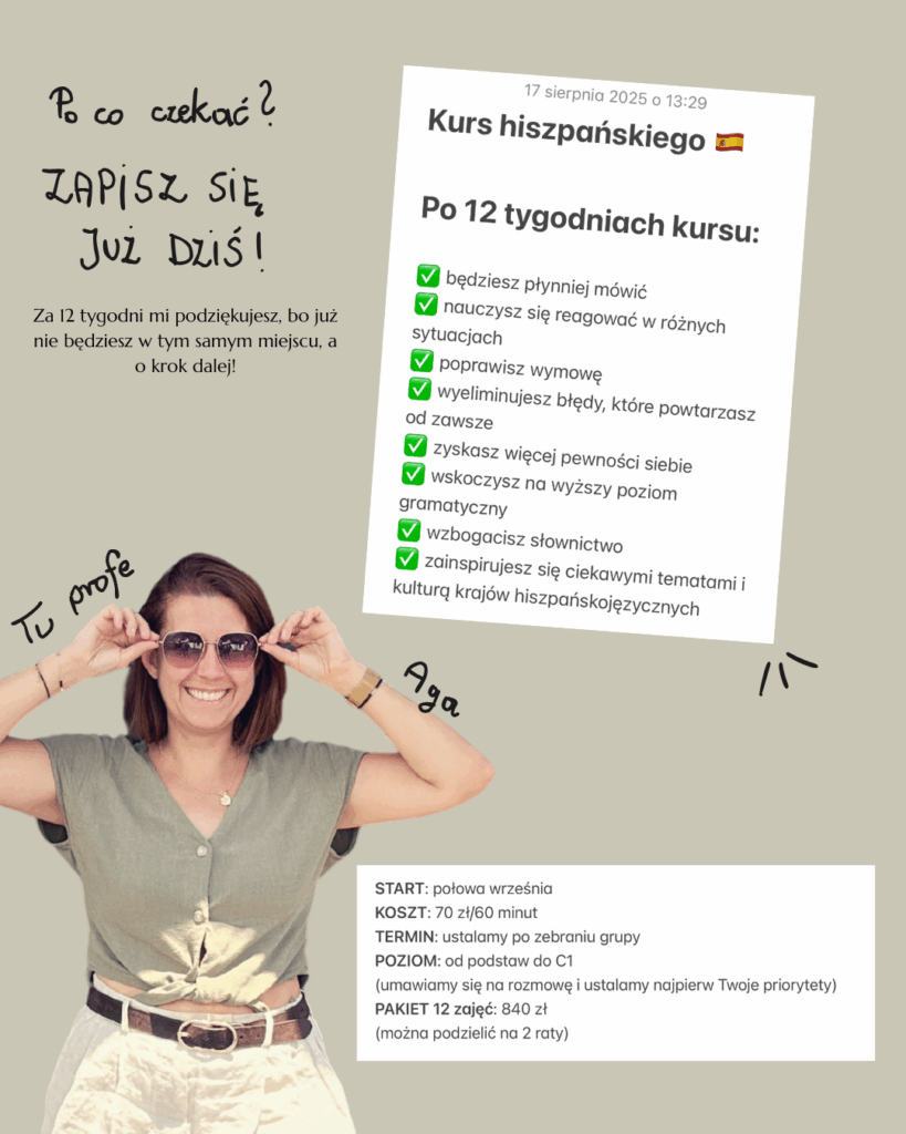Te zajęcia to idealny wybór dla osób, które chcą mówić płynnie i naturalnie po hiszpańsku, odkrywając jednocześnie piękno kultury języka. Jeśli szukasz praktycznego podejścia i atmosfery wsparcia, jesteśmy tu, by pomóc Ci osiągnąć Twoje cele i dobrze się przy tym bawić! 🎯