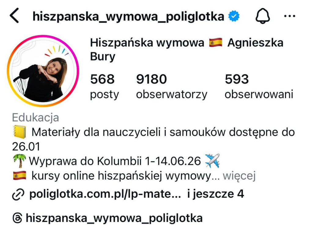 Dzielę się tam codziennością nauczycielki, językowymi refleksjami i wskazówkami, które pomagają oswoić mówienie po hiszpańsku.