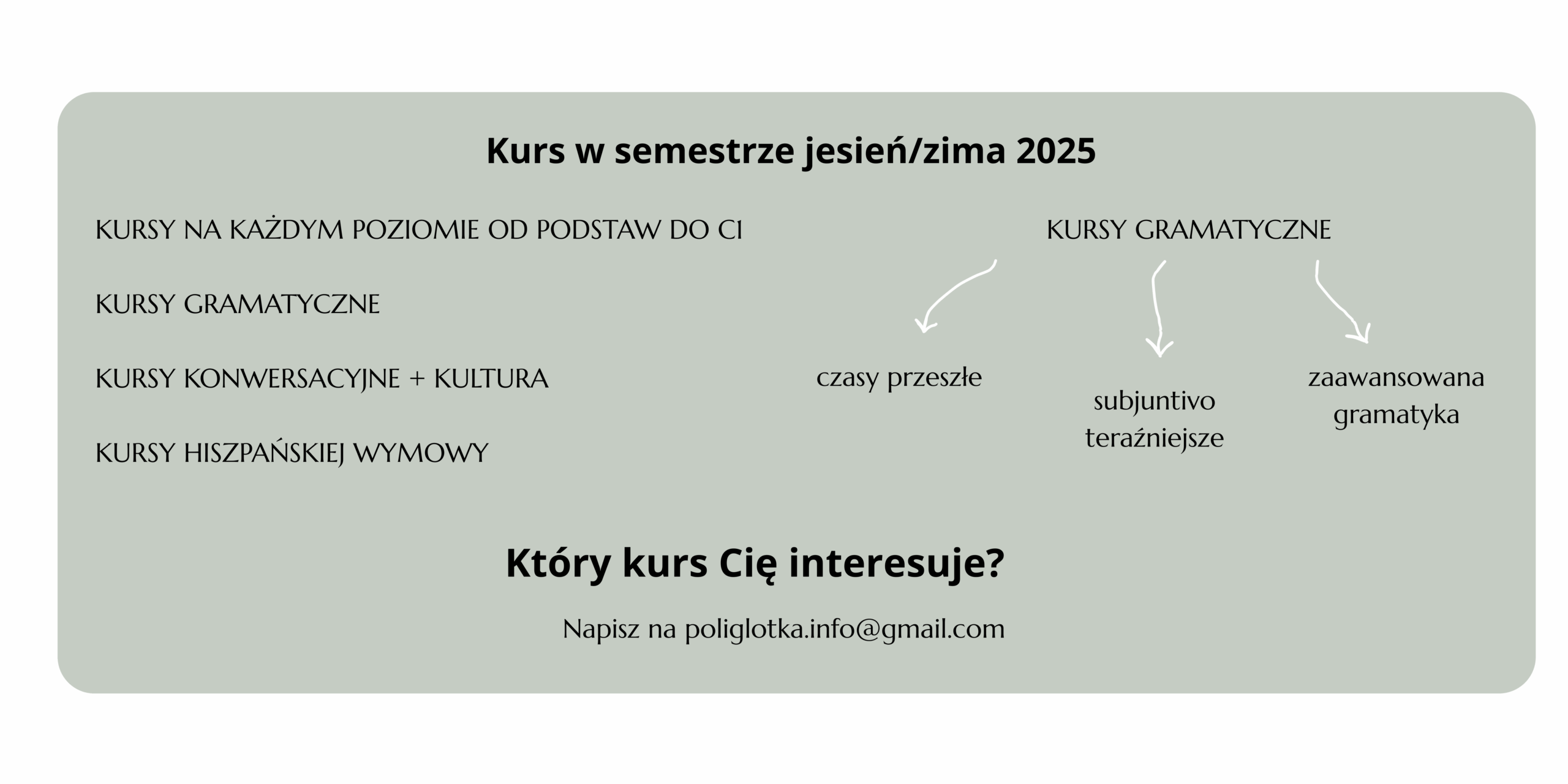 Szczegóły oraz informacje, czego nauczycie się na każdym z kursów, znajdziecie na slajdach karuzeli. Chętnie odpowiem na wszystkie pytania 🙂 Napisz na poliglotka.info@gmail.com