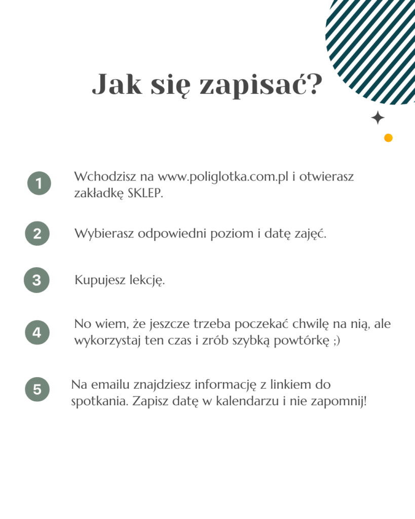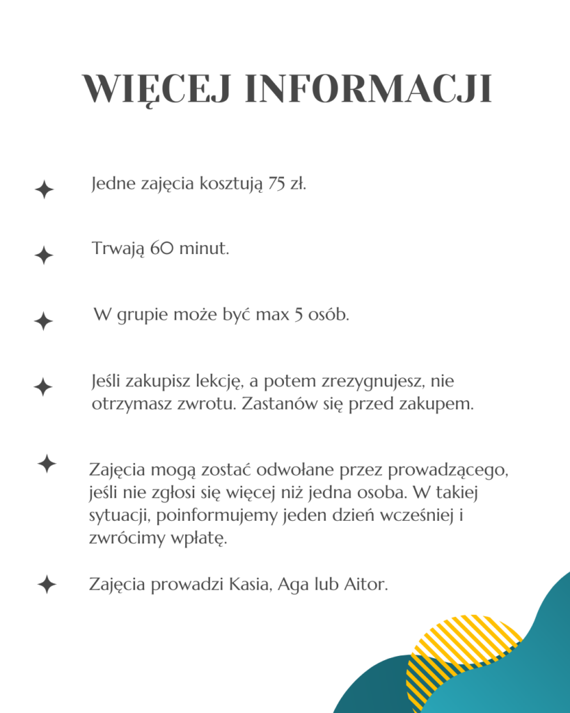 📅 Co tydzień będą pojawiać się nowe lekcje i nowe terminy. Kupując lekcję, rezerwujesz swoje miejsce na zajęciach.
